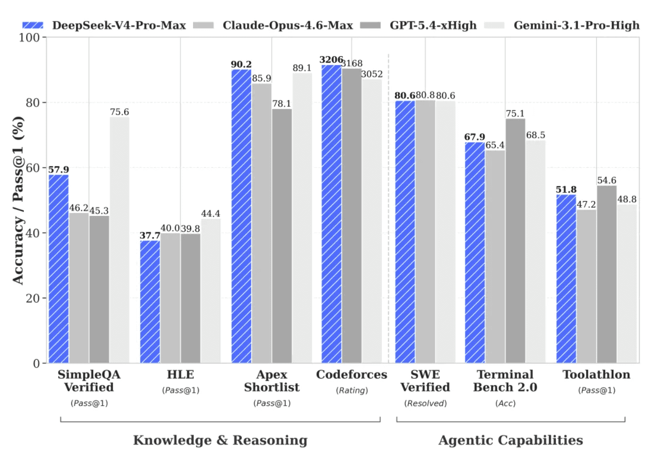 DeepSeek-V4-Pro-Max consistently outperforms previous open-source models and bridges the gap with leading closed-source models in reasoning, coding, mathematics, and agentic tasks.