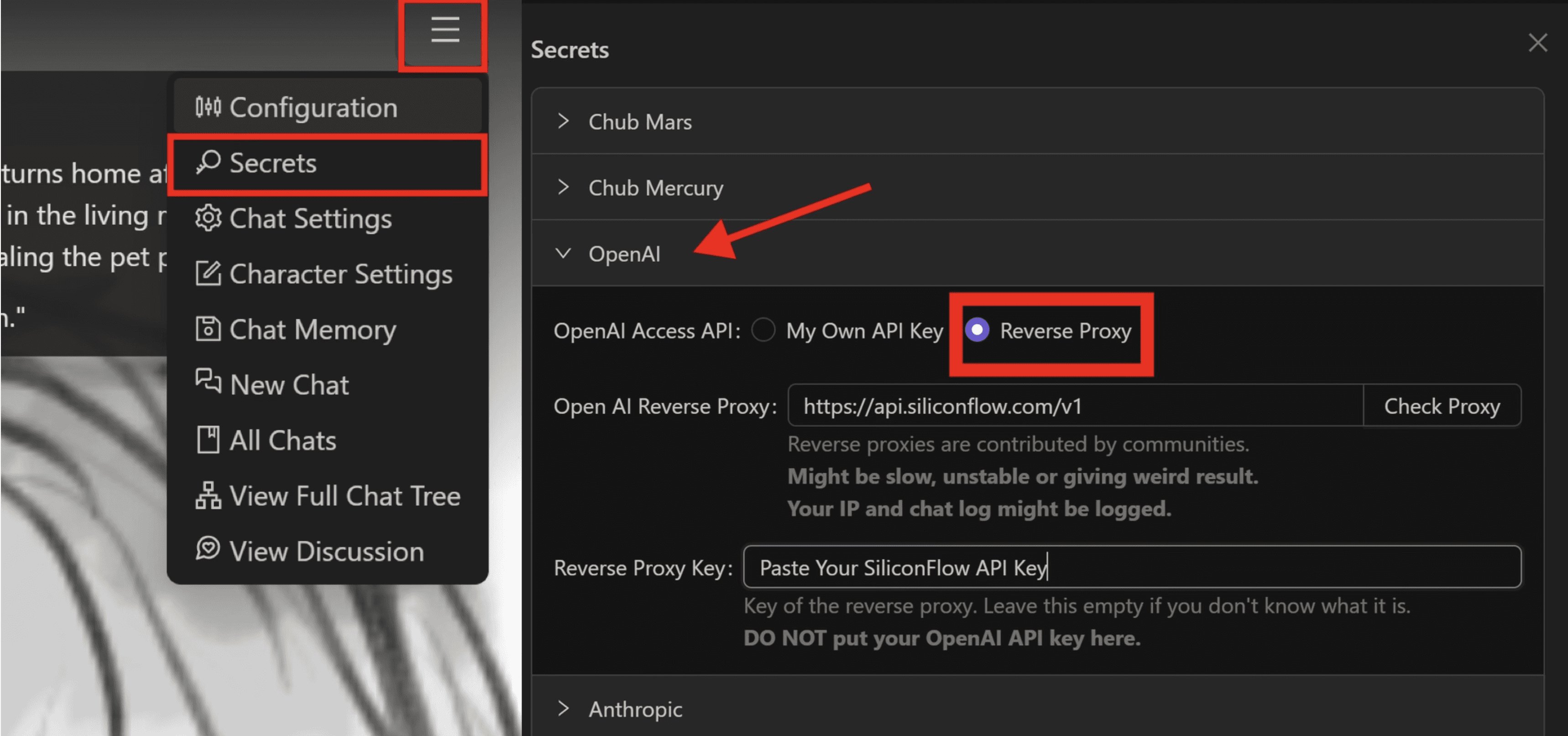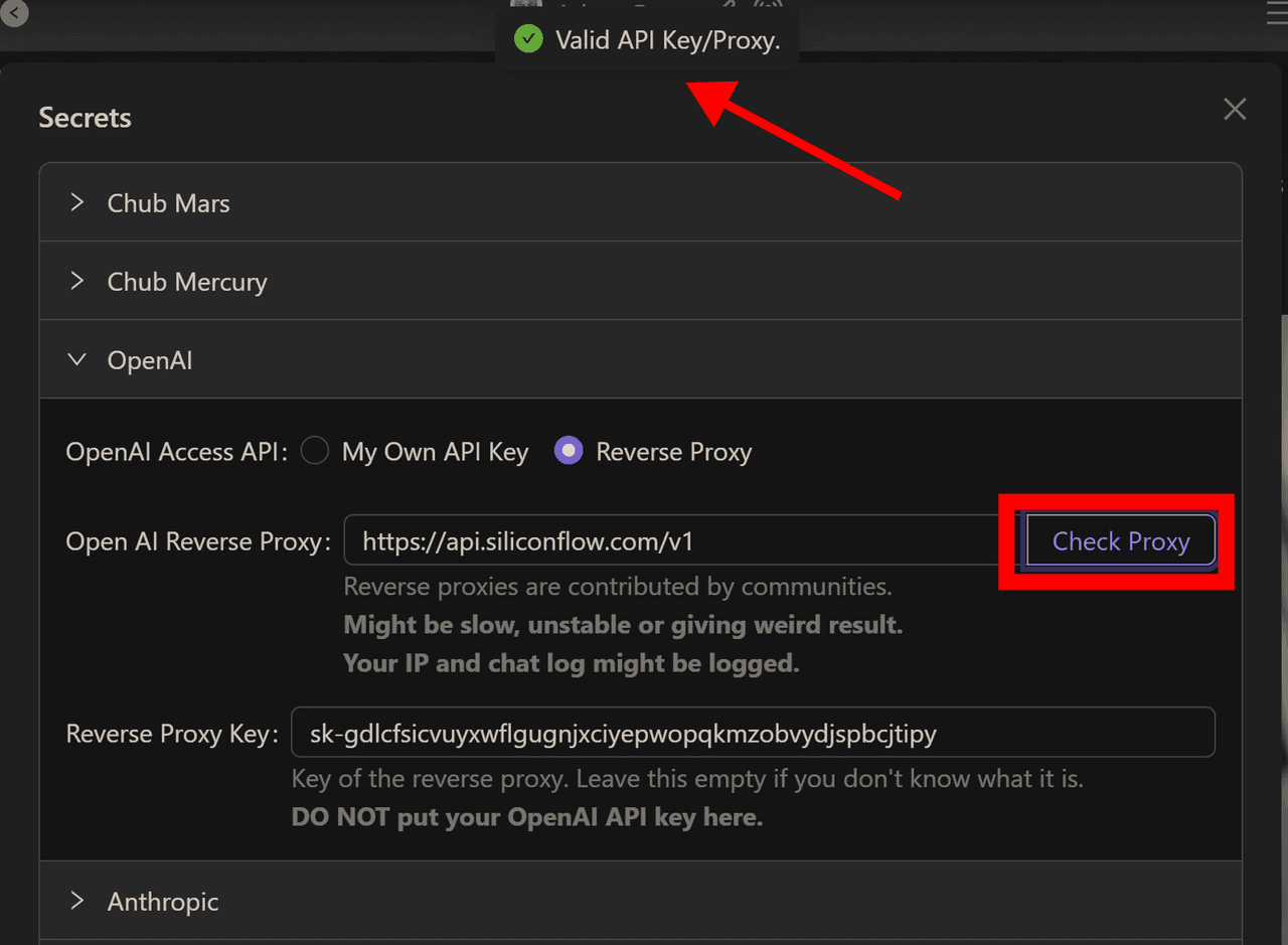 Reverse Proxy Key: Paste the SiliconFlow API key you copied in Step 1.