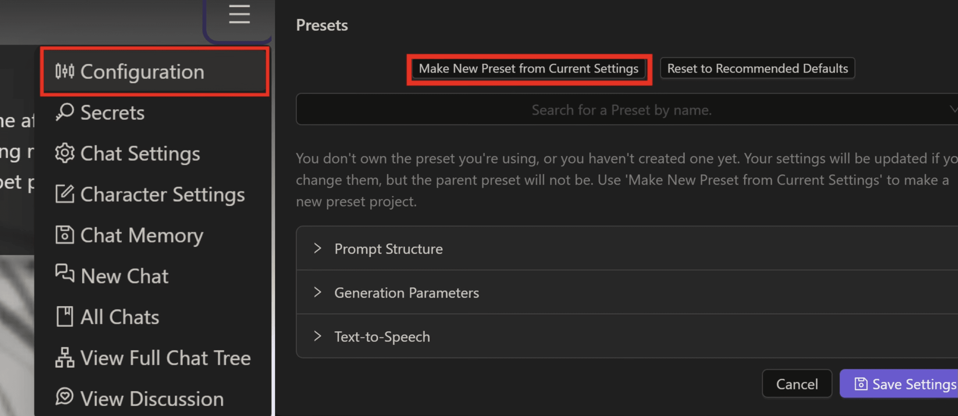 Create a preset: Navigate to Configurations and Make New Preset from Current Settings. Name your preset, adjust any settings to your preference and click Create.