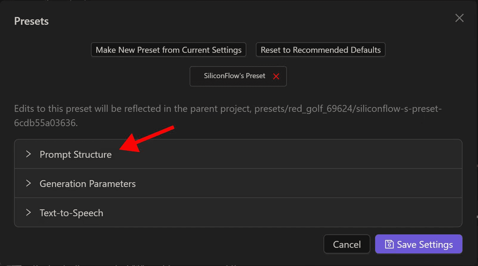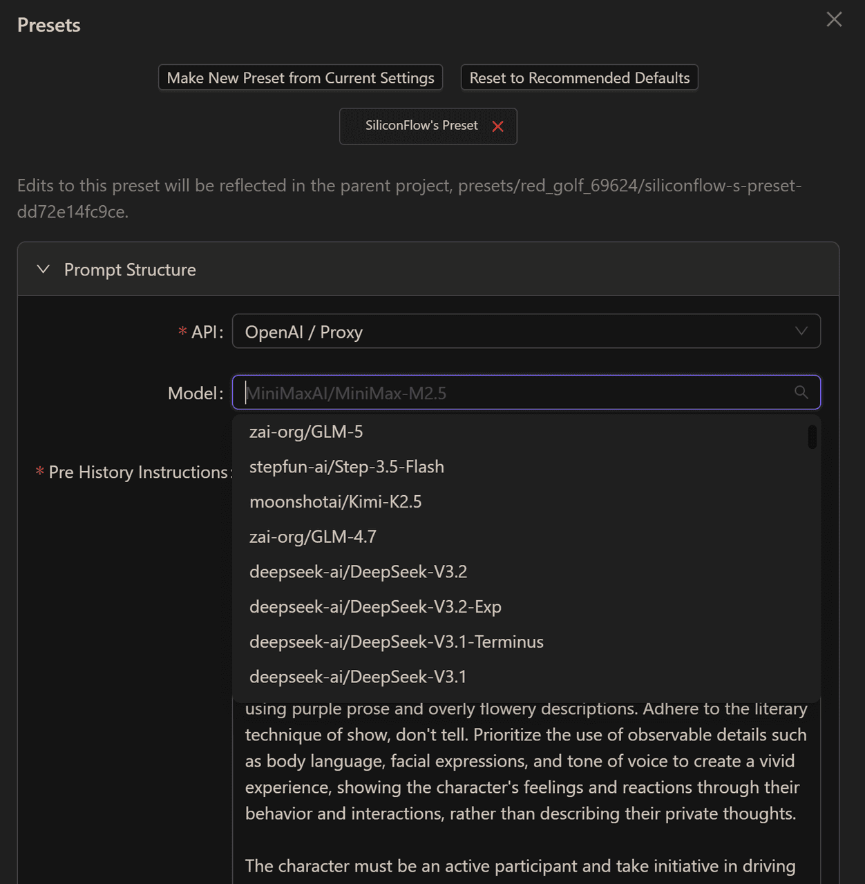 Select your model: Once your preset is created, return to the previous interface and open Prompt Structure. Set the API to OpenAI / Proxy — the full list of models available through SiliconFlow will appear. Select the one you'd like to use and save your settings.