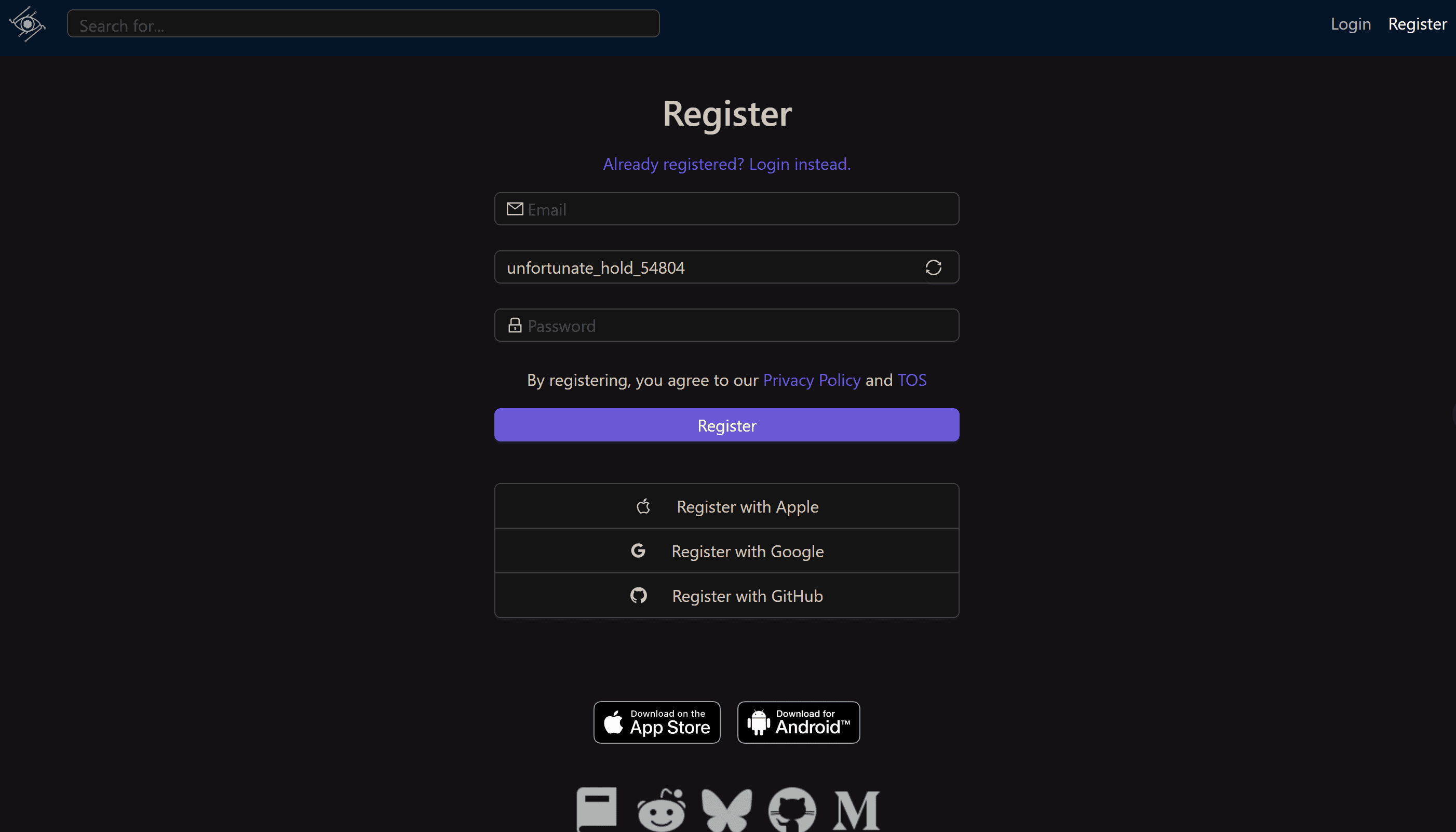 Enter your email address. You can also register with Apple, Google and Github accounts.