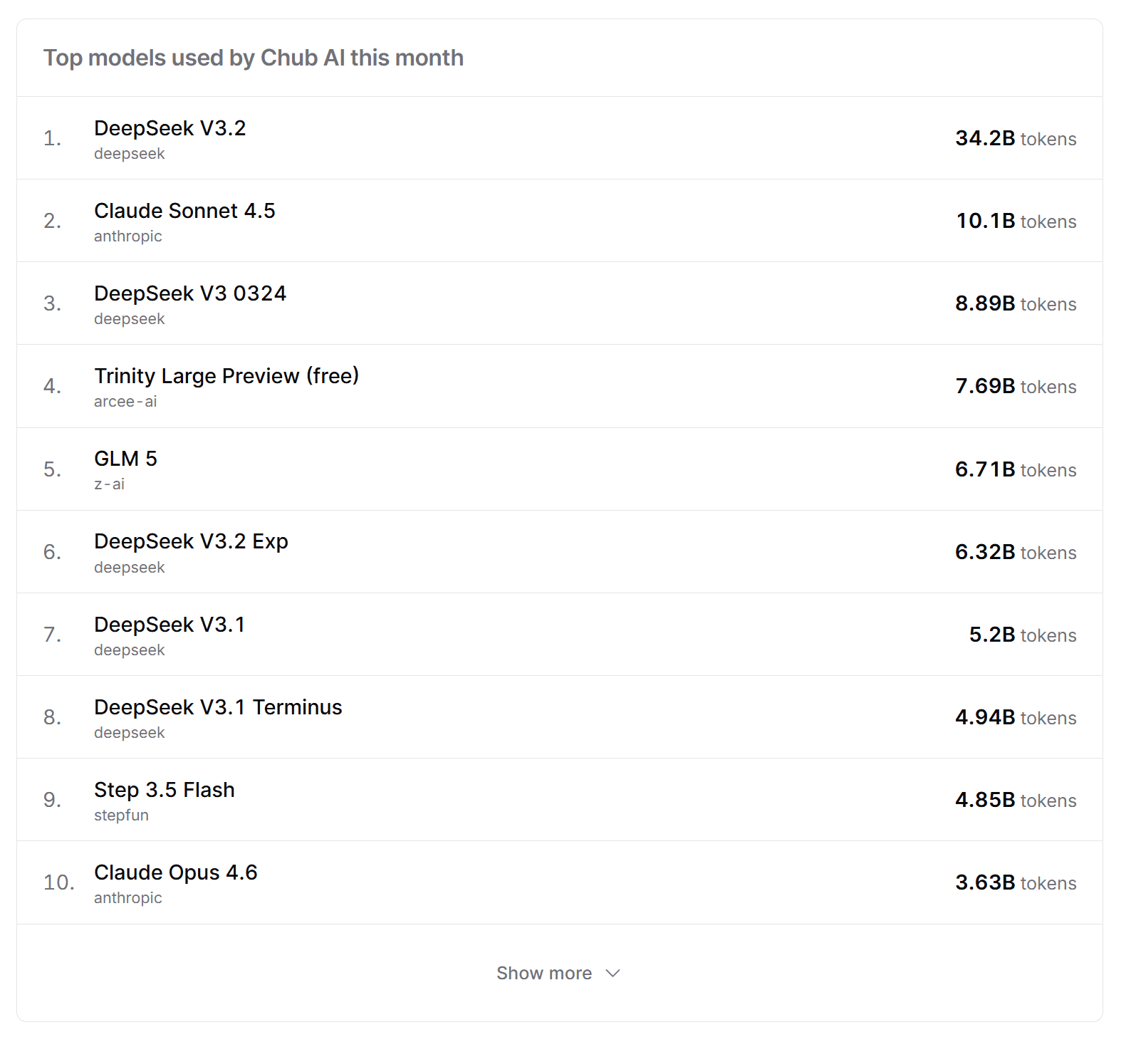 As of April 2026, the DeepSeek family is a clear preference, with DeepSeek V3.2 topping the chart and DeepSeek V3 0324 closely matching Claude Sonnet 4.5 in usage. GLM 5 and Step 3.5 Flash also see strong adoption in the rankings. All of the open-source models in the Top 10 are available on SiliconFlow and as the community's favorites evolve, so does our model library.