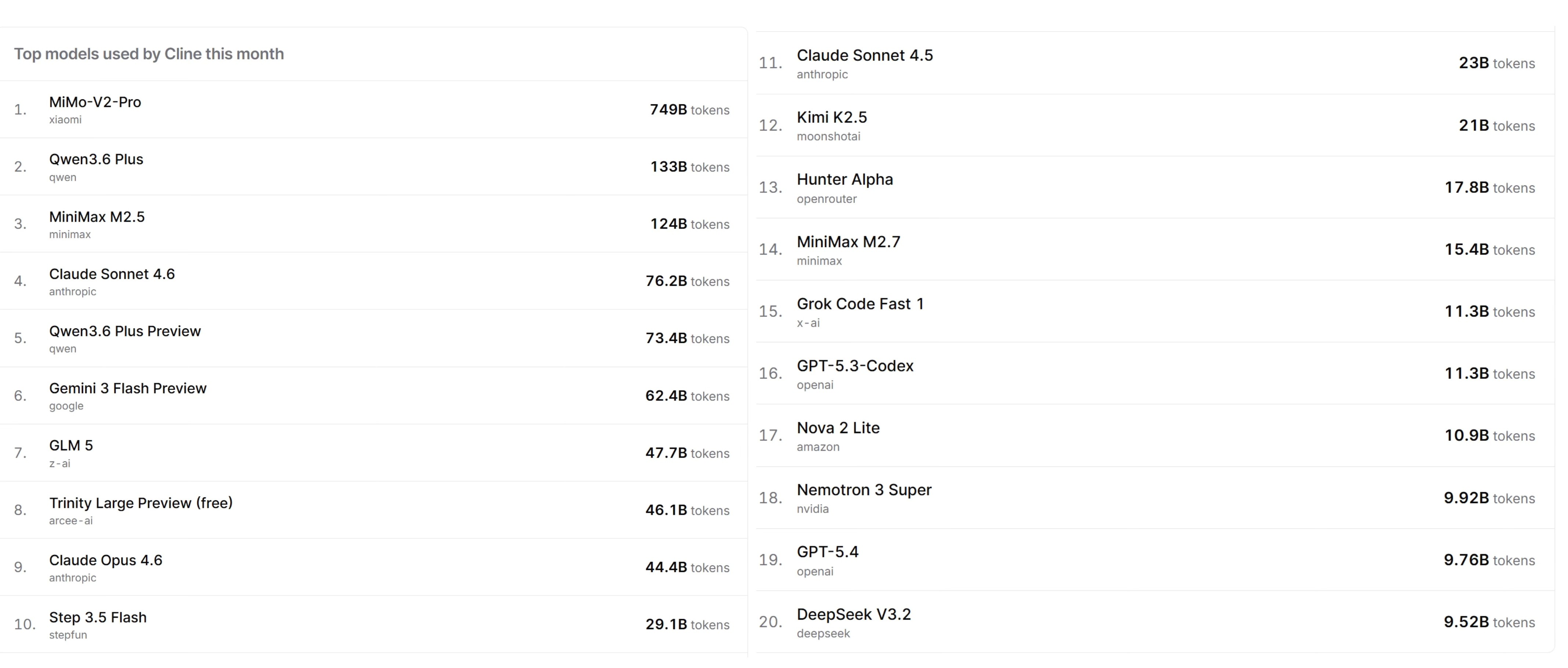 Based on Cline OpenRouter monthly usage, here are the most-used models by Cline users right now: