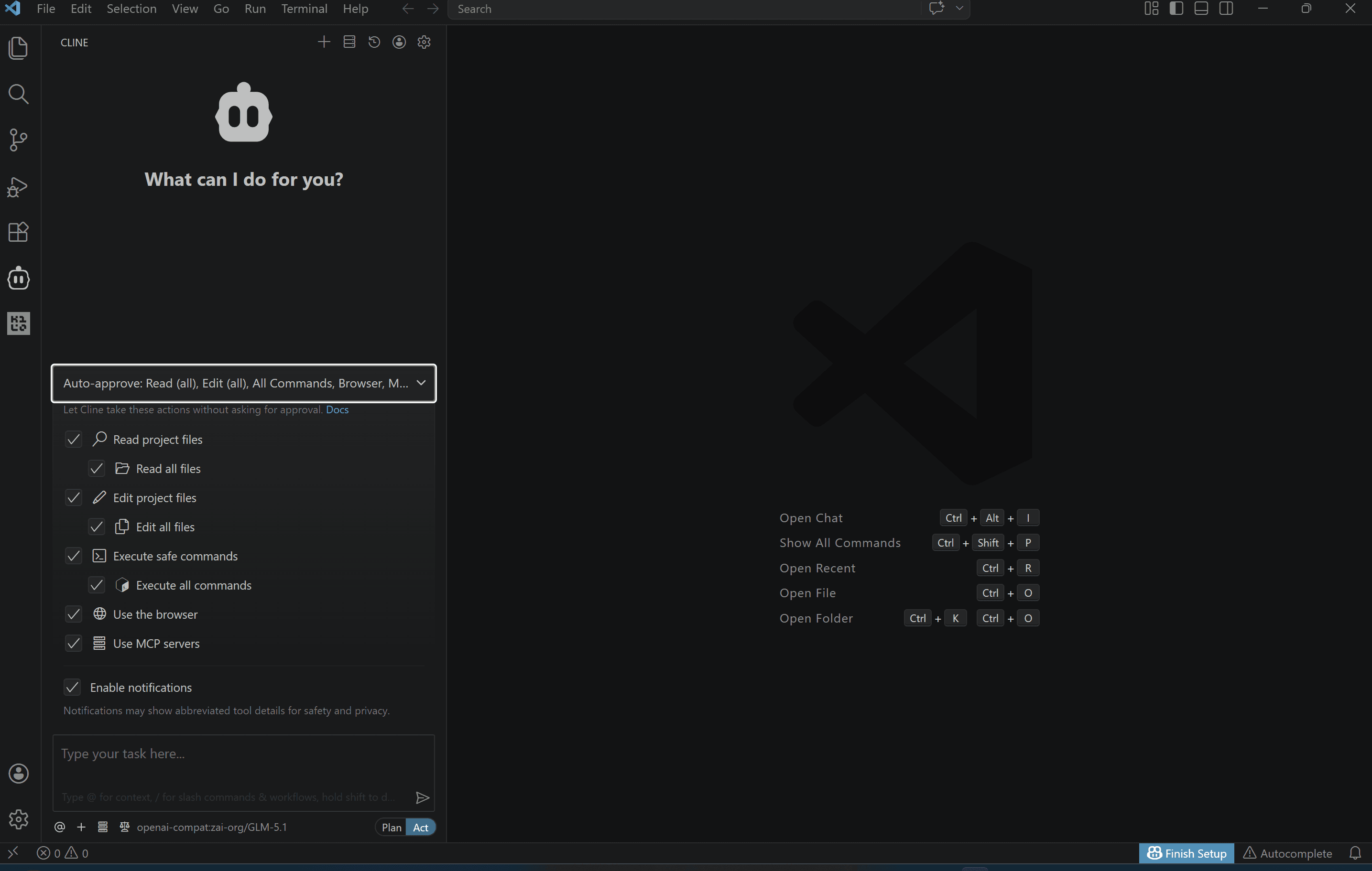 By default, Cline asks for your explicit approval before every file creation, file edit, or terminal command. If you'd like Cline to handle certain actions autonomously, you can configure this in the auto-approve settings, for example, allowing Cline to read files or run terminal commands without prompting you each time.