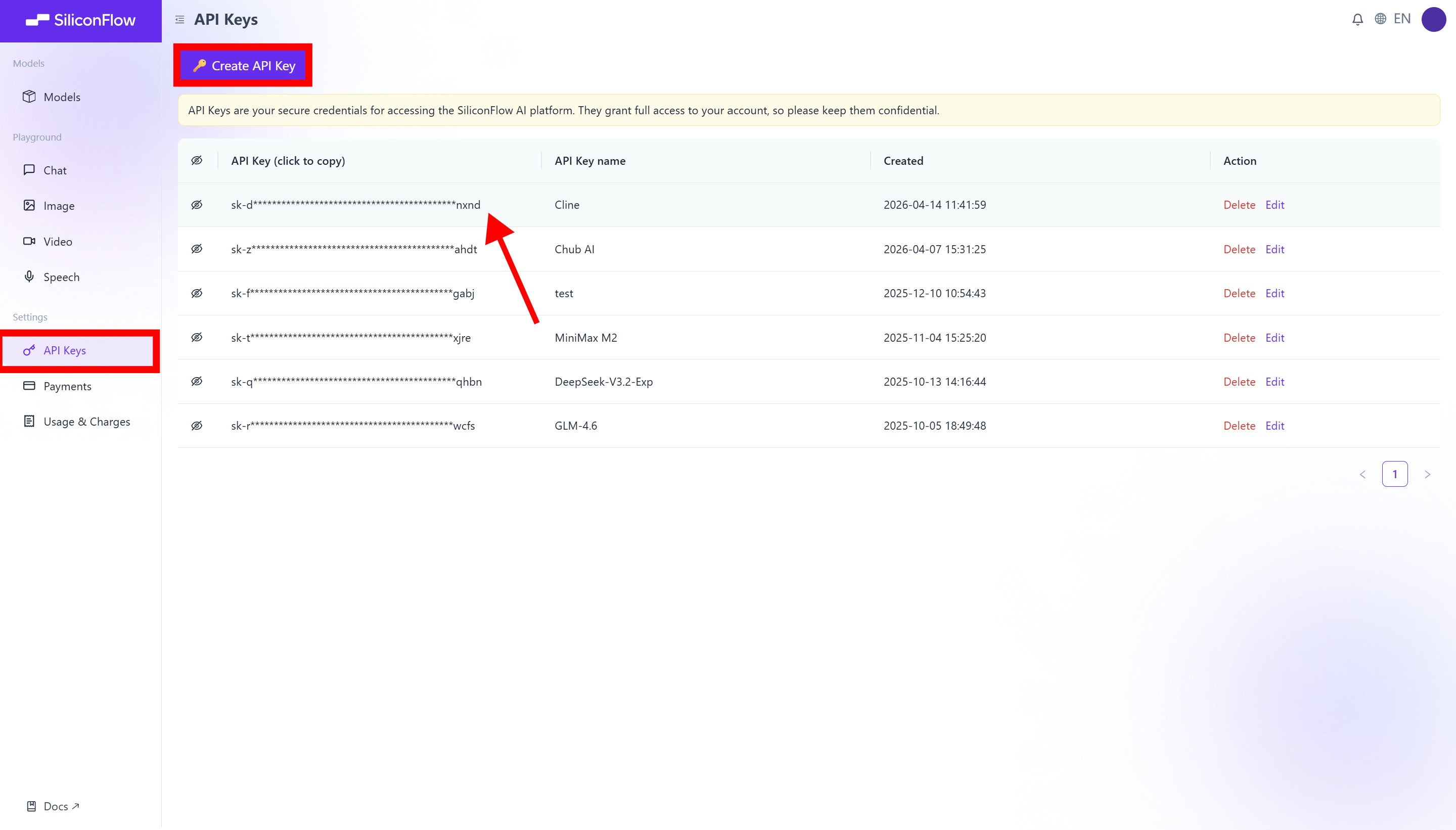 Click 🔑Create API Key and add a name to your key to help you identify it later, then confirm to create it.
