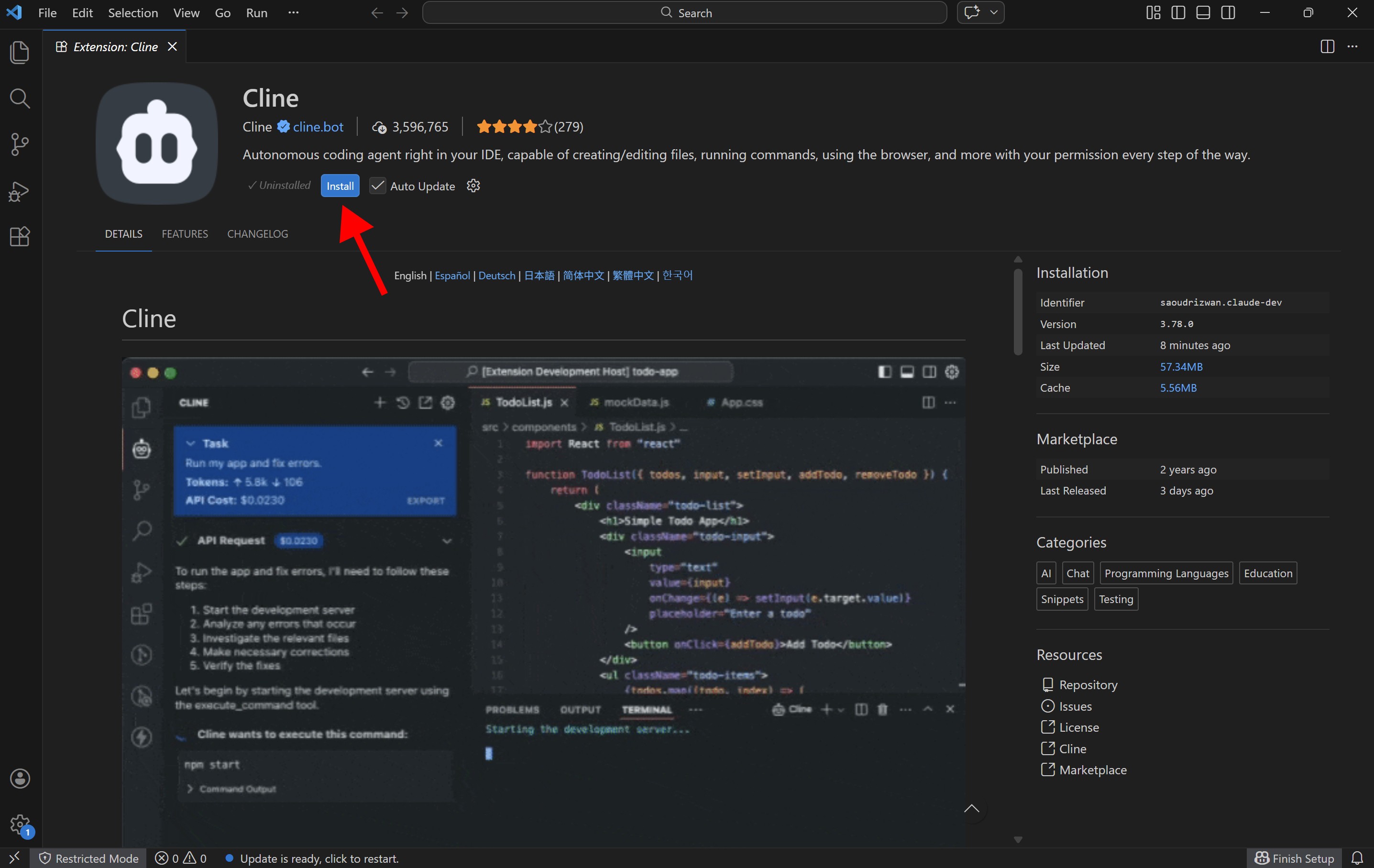 Click Install Cline in the top-right corner.