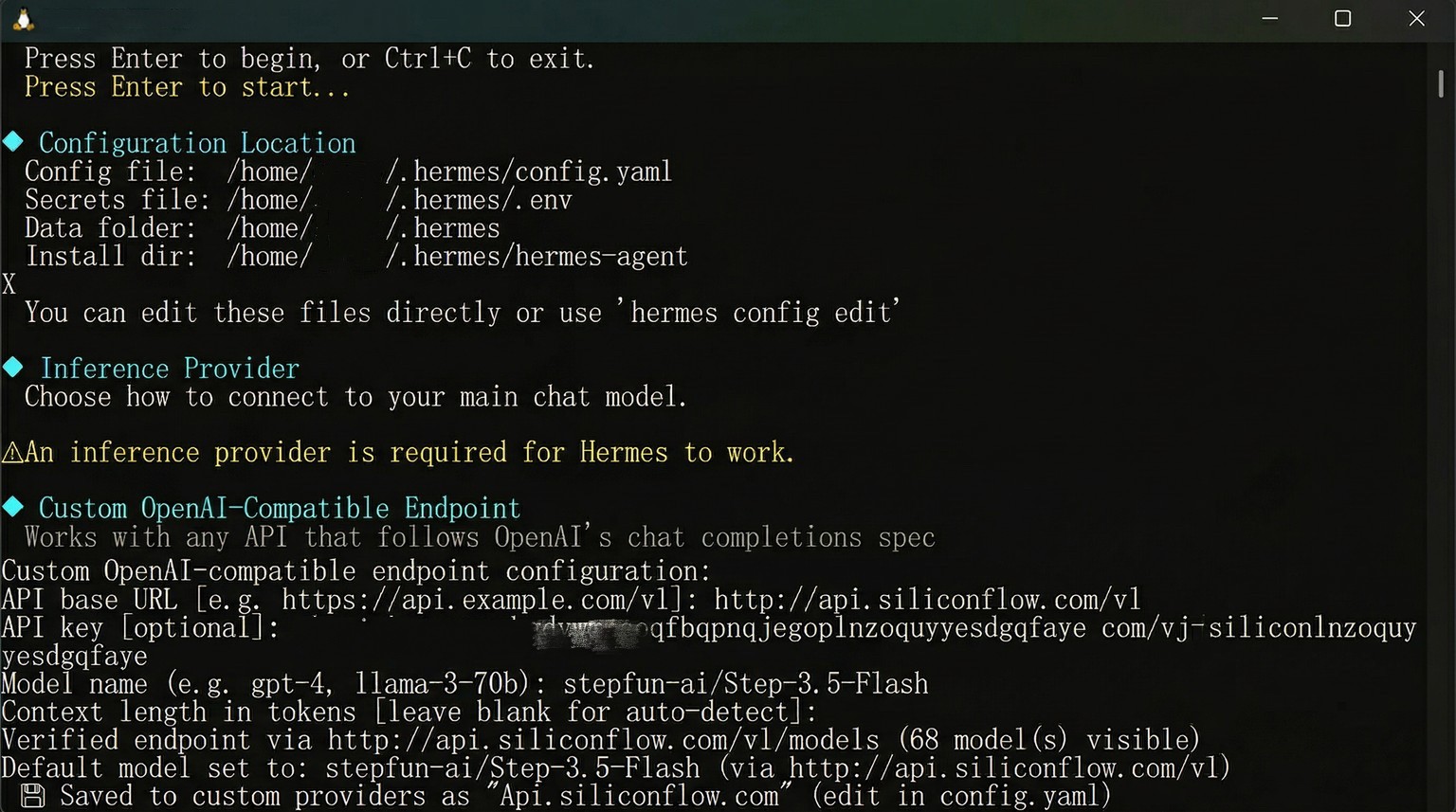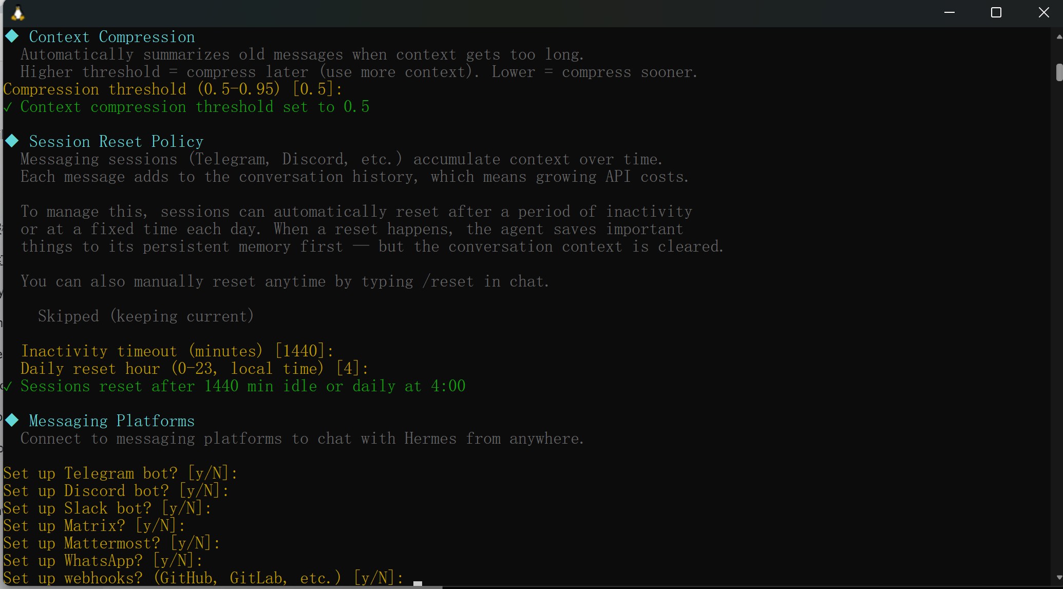 Hermes Agent will continue guiding you through additional configuration steps, including: