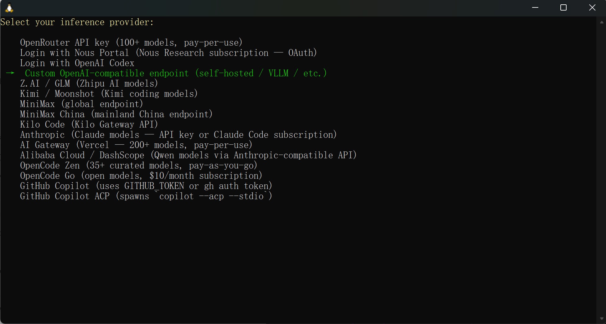 Select your inference provider: Custom OpenAI-compatible endpoint (self-hosted/VLLM/ect.)