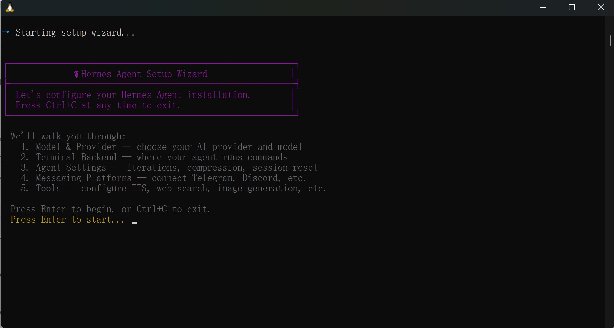 Once the installation completes, the Hermes Setup Wizard will launch automatically.