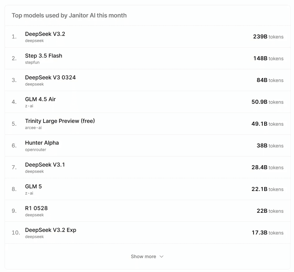 If you're not sure where to start, the OpenRouter Roleplay leaderboard is a useful reference. As of April 2026, the most-used models by Janitor AI users on Openrouter are largely dominated by a handful of open-source models. SiliconFlow supports all of them ranked within the Top 10, including DeepSeek V3.2, Step 3.5 Flash, DeepSeek V3 0324, GLM 4.5 Air, DeepSeek V3.1, GLM 5, DeepSeek R1 0528, and DeepSeek V3.2 Exp.