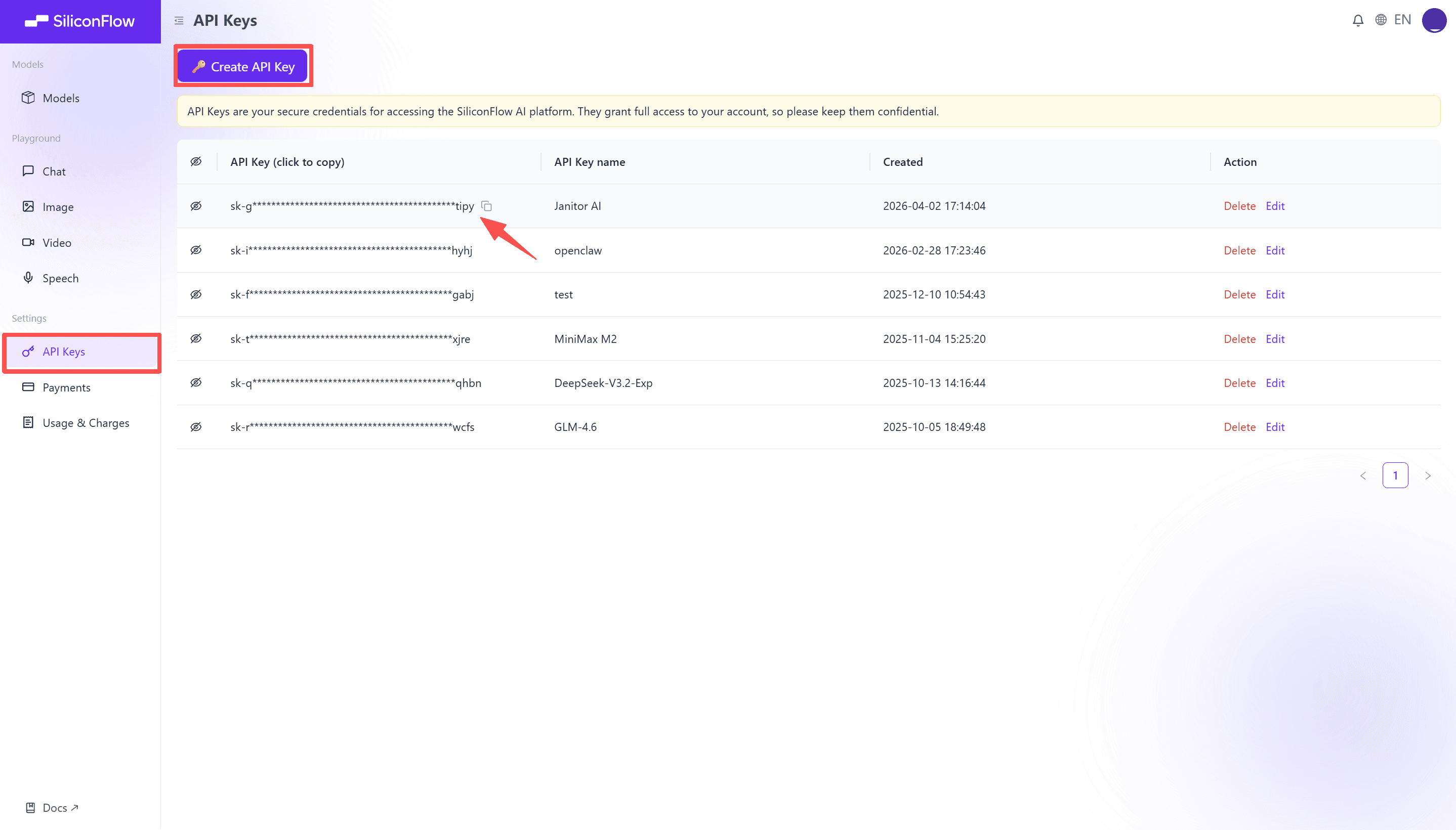Click 🔑Create API Key and add a name to your key to help you identify it later, then confirm to create it.