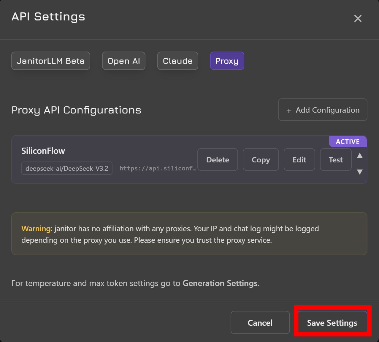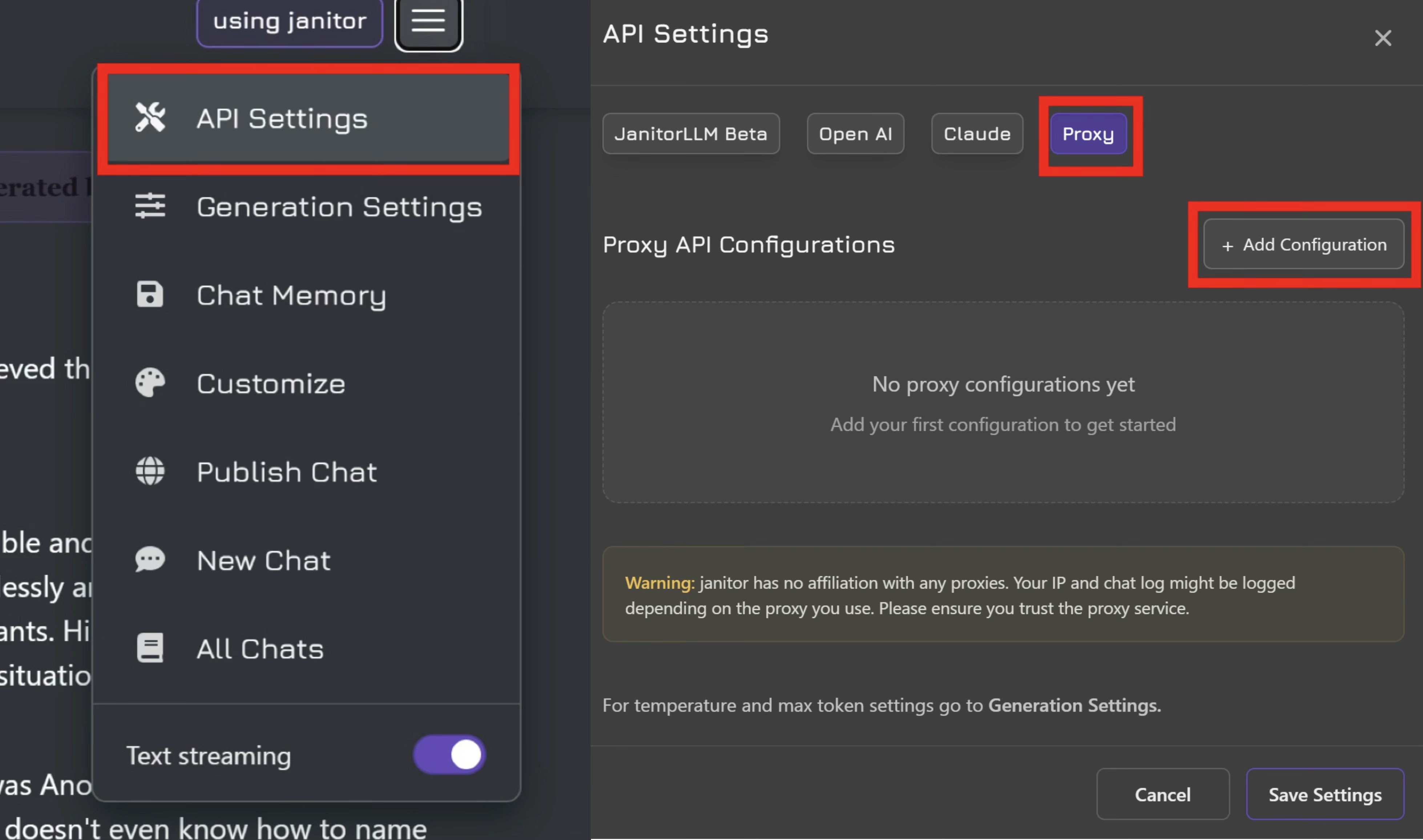 API Settings: In the chat, click the gear icon (top-right) → "API Settings" → "Proxy" → "Add Configuration".