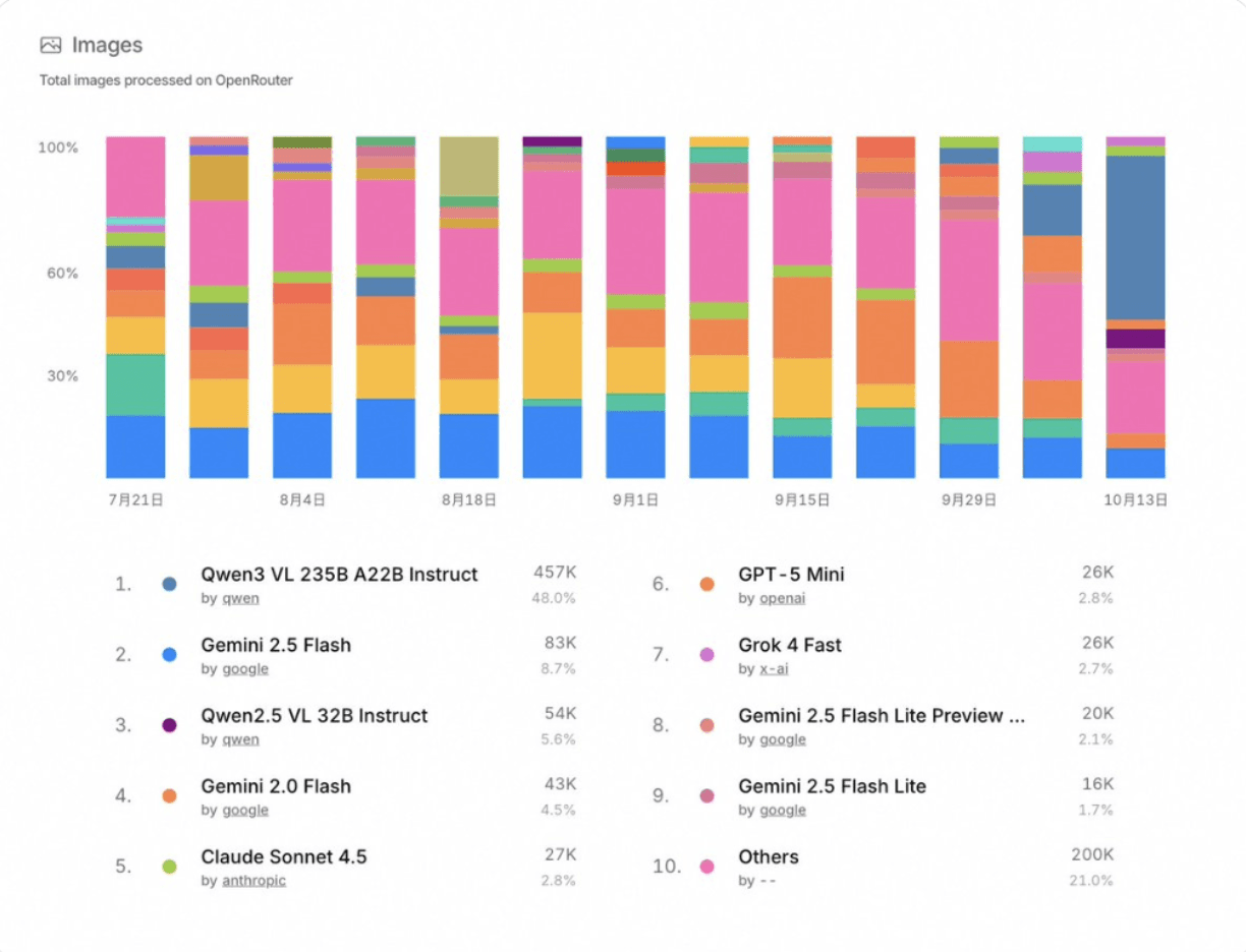 除了基準表現,Qwen3-VL-235B-A22B-Instruct也在開源社群中取得了顯著的吸引力。根据OpenRouter的最新统计(2025年10月),它在图像处理方面排名#1,占48%的市场份额,超过其他领先的多模态模型如Gemini 2.5 Flash和Claude Sonnet 4.5。